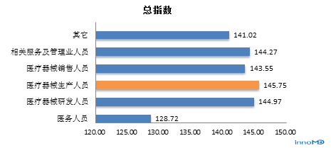 医疗器械生产人员总信心指数最高,而医务人员最低